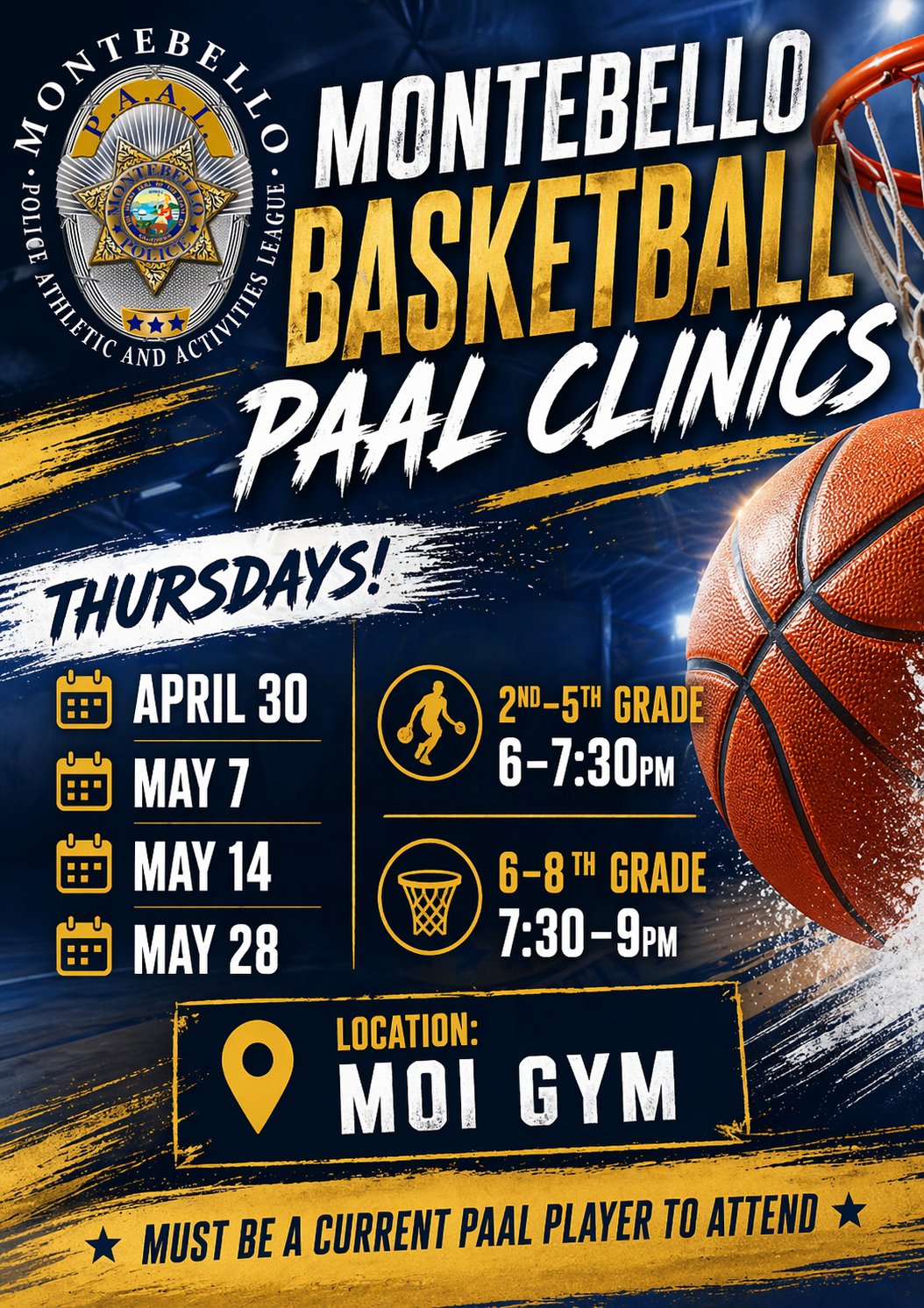 2026 Montebello Basketball PAAL Clinics. Must be a current PAAL player to attend.